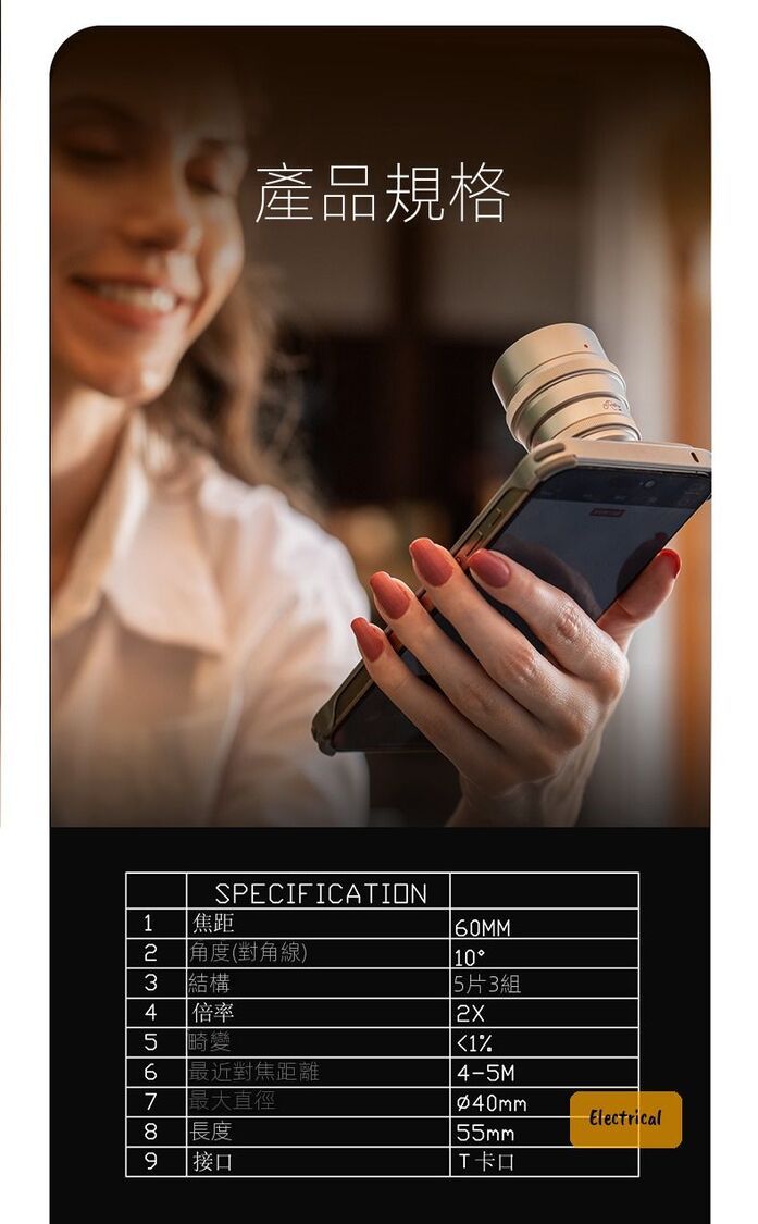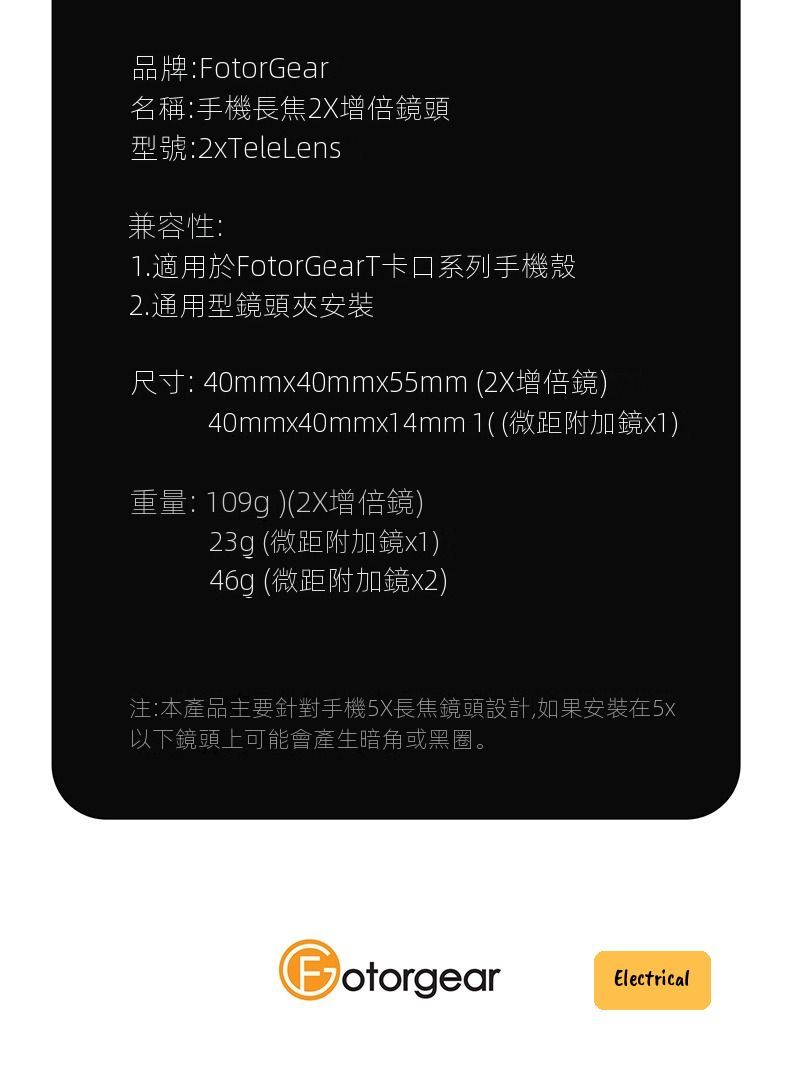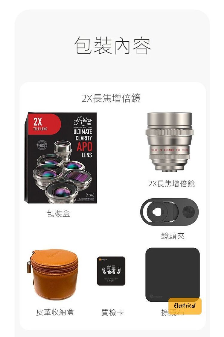 - 包裝內容:2X長焦增倍鏡、鏡頭夾、皮革收納盒、擦鏡布、質檢卡