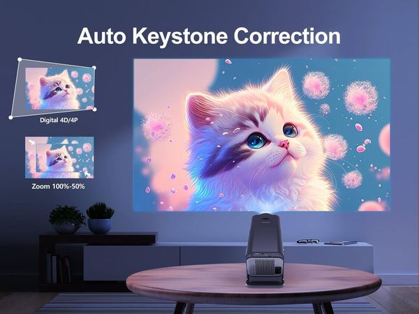 短焦投影和大螢幕:4K 投影機引入了創新的 1.1:1 投影比,讓您即使在狹窄的空間也能享受廣闊的螢幕。 與其他產品相比,HY320 提供更大、更清晰、更明亮的影像,為您的臥室、會議室和房車提供增強的適應性。 這款 4k 投影機的最大螢幕尺寸為 150 英寸,最小距離為 1 米,可根據您的喜好提供無與倫比的觀看體驗。 自動梯形校正和 180° 旋轉設計:便攜式投影機具有自動垂直梯形校正和手動四點梯形校正功能。 享受輕鬆、快速的調整,確保從任何投影角度都能獲得完美的影像。 創新的180°旋轉設計,可輕鬆指向各個方向,讓您躺在床上也能欣賞天花板上的電影,獲得身臨其境的觀看體驗。 此外,它還具有縮放功能,增加了多功能性。