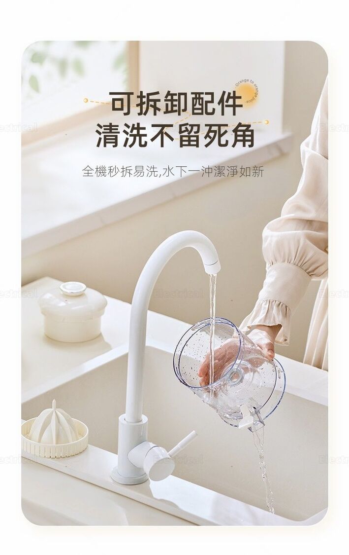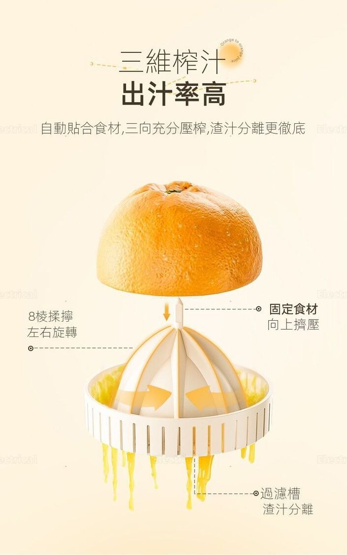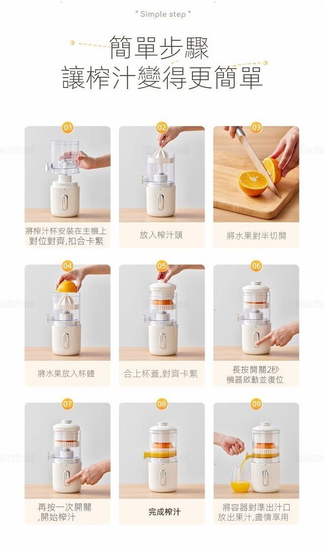 - 全自動操作:水果自動對位,撳個掣就榨好,唔使用力按。