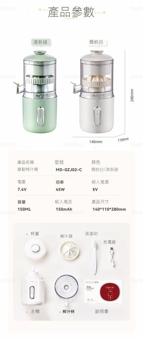 - 配件:榨汁頭、清潔刷、USB線