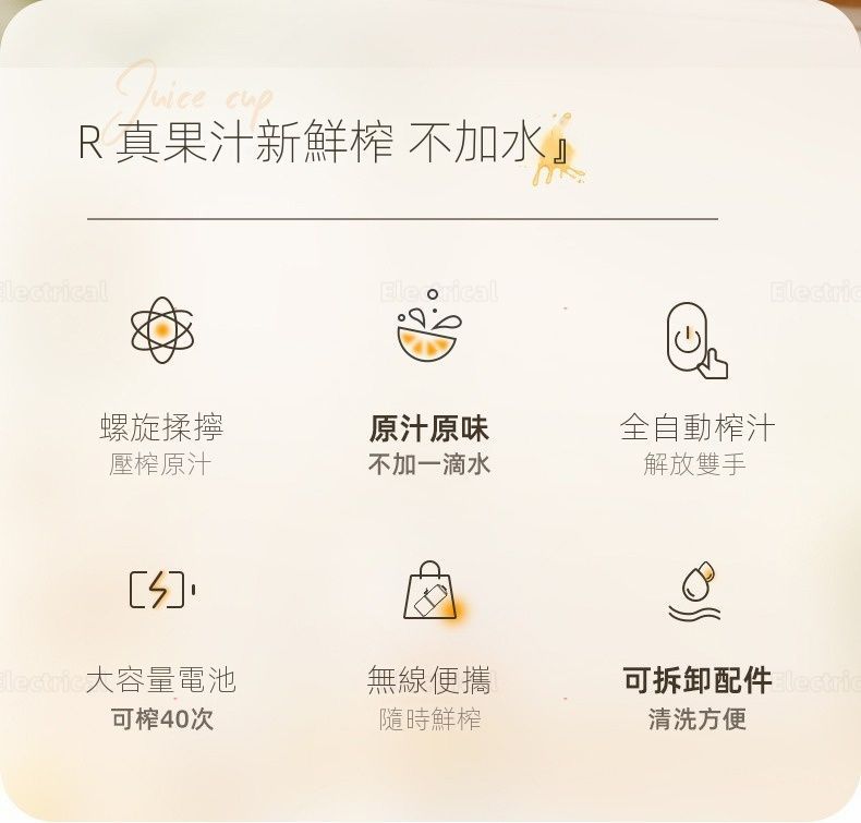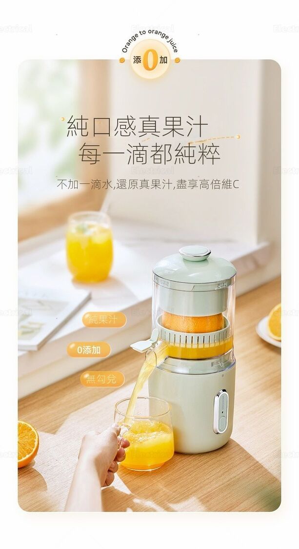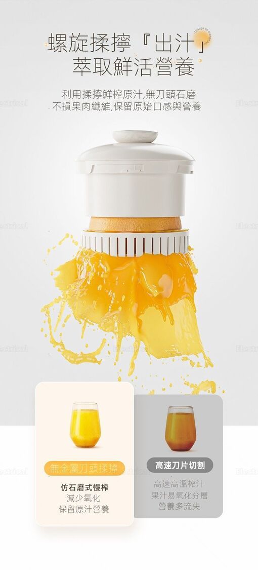 - 純正果汁:獨家螺旋揉擰技術,唔用刀頭慢速壓榨,保留維C同營養。