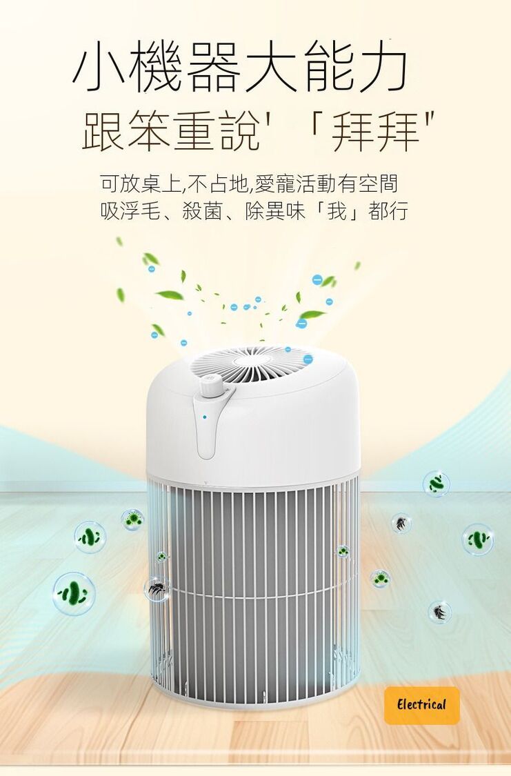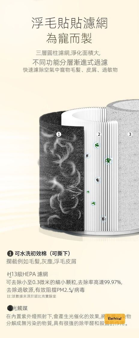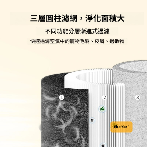 - 三層漸進式過濾系統:攔截毛髮→HEPA過敏原→光觸媒除味