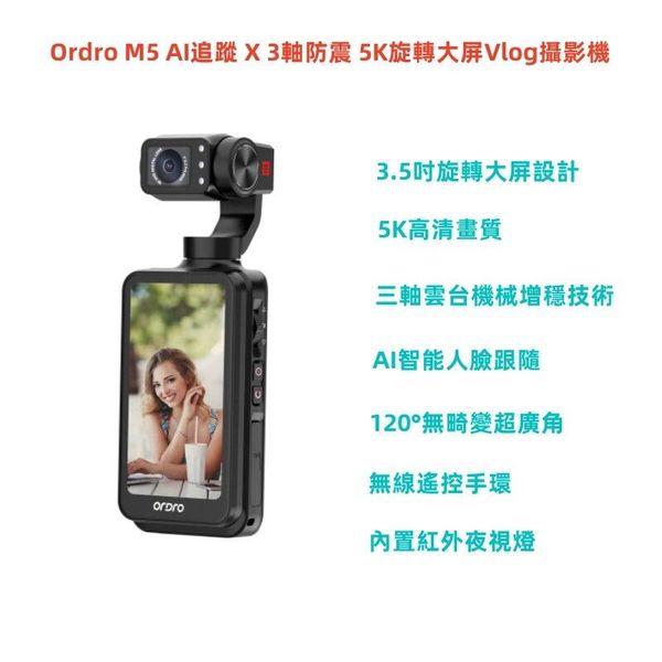 2024最新款「Ordro M5 AI追蹤 X 3軸防震 5K旋轉大屏Vlog攝影機」全新升級的三軸雲台機械增穩技術,搭配全程 AI 智能跟隨,不論是拍攝特殊活動還是日常Vlog,這款攝影機都能提供穩定流暢的畫面。創新3.5吋旋轉大屏設計,比起市面上的眾多雲台相機看得更清晰!5K高清畫質,讓你隨時隨地輕鬆記錄與分享生活中的美好時刻✨