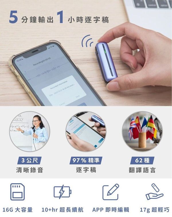 本次隆重推出「Wooask 3in1 錄音翻譯筆」,改良尺寸、音質、速度,將錄音、逐字稿和翻譯的痛點整併在一支,希望在紀錄生活、紀錄重要時刻的路上,能夠為大家帶來全新體驗。