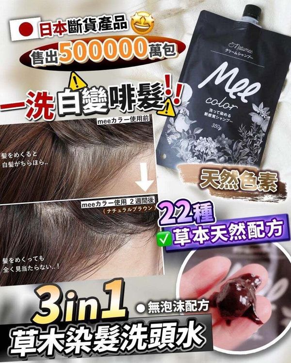 一洗即染白髮,效果顯著 無泡沫配方 天然色素,22種草本天然配方 奈米分子和木炭的雙重溫和成分 染髮同時保護髪絲及頭皮,增加頭髮彈性 保持髮絲柔順光澤 雙手不留下染色劑,超級易用 男女皆合用 全球斷貨 淺啡色 氣味清新自然