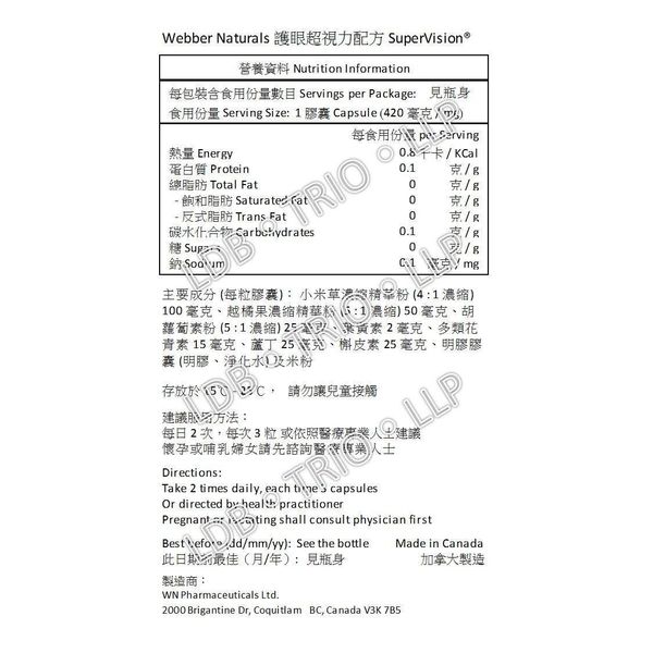 Webber Naturals 超級護眼草本葉黃素配方 精華是一種膳食補充劑,含有葉黃素和其他有益於眼睛的植物提取物,支持健康的視力。 它含有越橘提取物以及花青素,蘆丁和槲皮素。 這些生物類黃酮成分共同支持視網膜血液循環及眼睛細小血管。