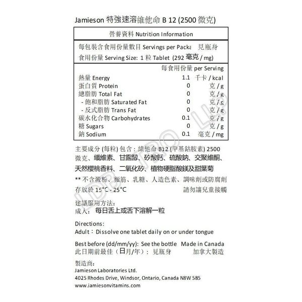 Jamieson-[贈品] 特強速溶維他命 B12 (2500 微克) 10 粒輕便裝 [平行進口] 此日期前最佳: 2025年4月