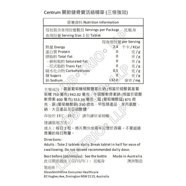 為您的關節提供及保持運動所需的支持! Centrum 關節健骨寶活絡精華 (三倍強效) 結合了量身定制的葡萄糖胺活絡精華,可有助舒緩輕度關節疼痛,軟骨素可支持關節軟骨健康生成,錳及銅支持骨骼和肌肉健康及膠原蛋白形成。