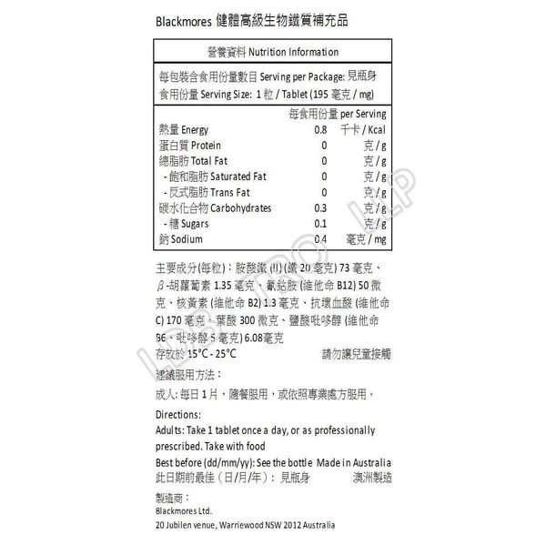 BLACKMORES-健體高級生物鐵 補鐵片 30粒[平行進口]此日期前最佳:2025年04月30日