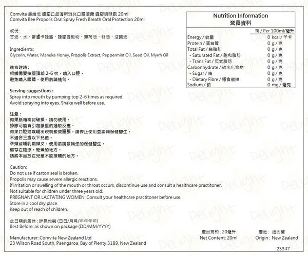 Comvita康維他-蜂膠口腔噴霧 蜂膠噴喉劑 20ml -(9400501003509) -平行進口商品