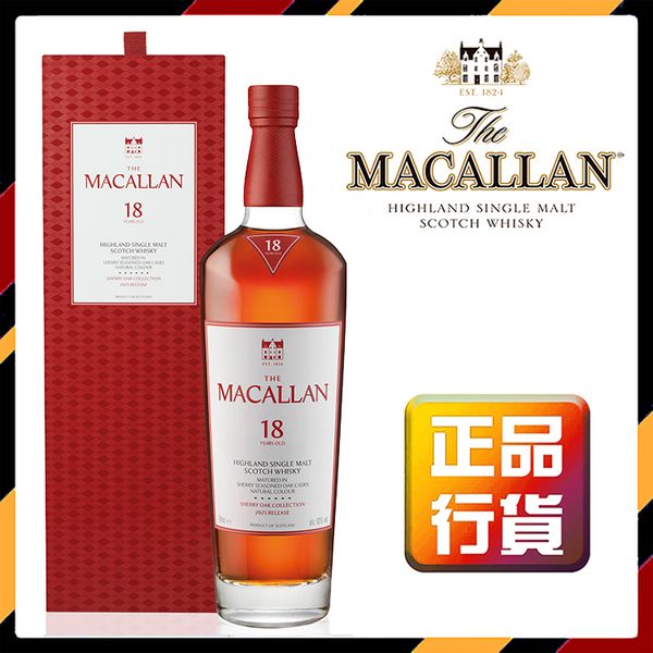 麥卡倫經典雪莉桶系列酒款 — 麥卡倫經典雪莉桶18年。該系列單一麥芽威士忌以來自赫雷斯 ( Jerez ) 的歐洲橡木雪莉桶熟成,為其賦予濃郁香醇、層次豐富的風味。 口感飽滿醇厚,呈現成熟橡木、生薑和葡萄乾風味,搭配天然的淺紅木酒色,更顯完美。