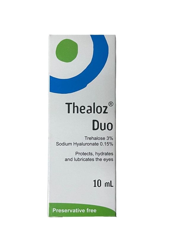 -Thealozo Duo將0.15%透明質酸與3%天然成分海藻糖在低滲配方中的結合,具有保護和再生功效的雙重功效。透明質酸保濕眼睛表面,改善淚膜,延長淚液停留時間。它還有助於角膜的再生,並促進傷口癒合