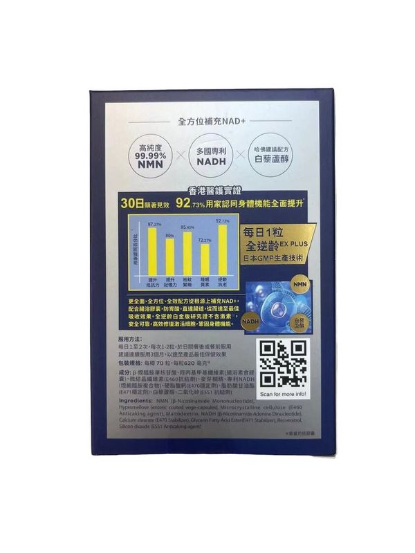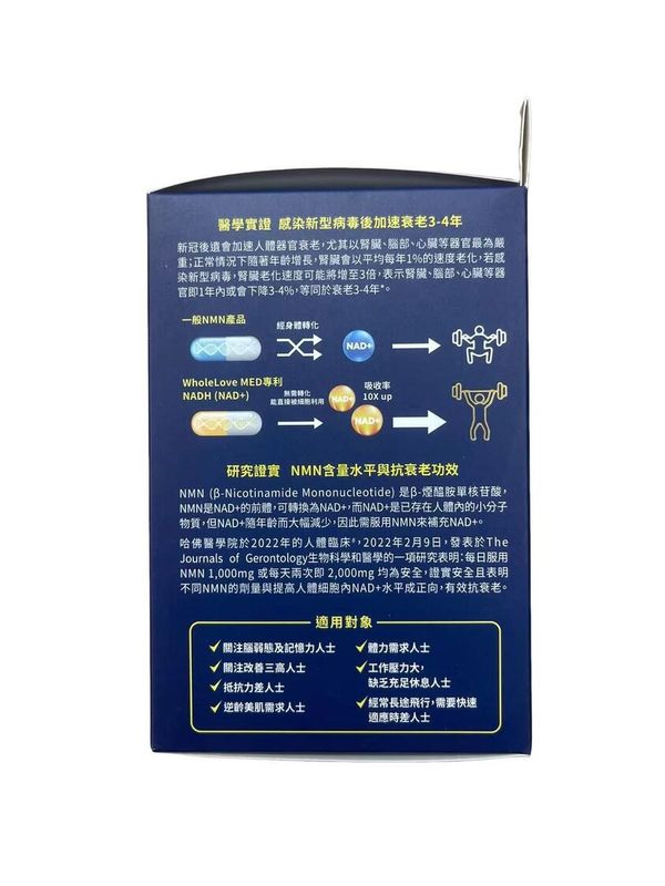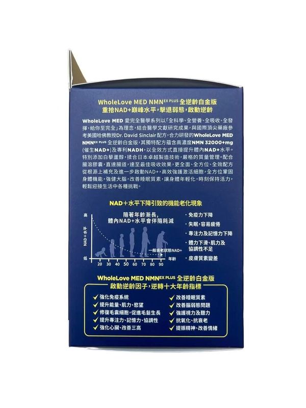 WholeLove MED 愛完全醫學系列以「全科學、全營養、全吸收、全發揮,給你至完全」為理念,結合器學文献研究成果,與國際頂尖藥廠參考美國哈佛教授Dr.David Sinclair配方,合力研發的WholeLoveMED NMNEX 全逆齡白金版,其獨特配方蘊含高濃度NMN 32000+mg (催生NAD+) 及專利NADH,以全效方式直接提升體內NAD+ 水平。特別添加白藜蘆醇,揉合日本卓越製造技術,嚴格的質量管理。配合腸溶膠囊,直達腸道,達至最佳吸收效果,更全面、全方位、全效配方從根源上補充及進一步啟動NAD+,高效強護激活細胞,全方位單固身體機能,強健大腦,改善睡眠質素,讓身體年輕化,時刻保持活力,輕鬆迎接生活中各種挑戰。