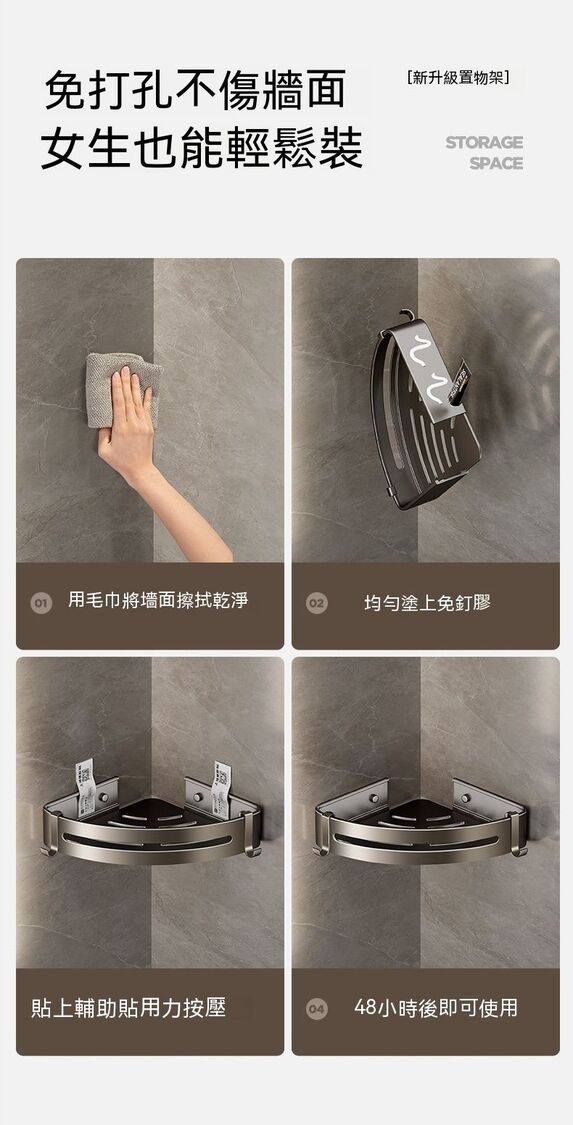 全城熱賣-鋁質免打孔無痕 衛生間置物架 衛浴收納架 壁掛浴室三角架 廁所轉角 浴室置物架 鋁質掛籃 掛鉤 廚房置物架 化妝品收納架加厚款單層槍灰加厚款單層黑色