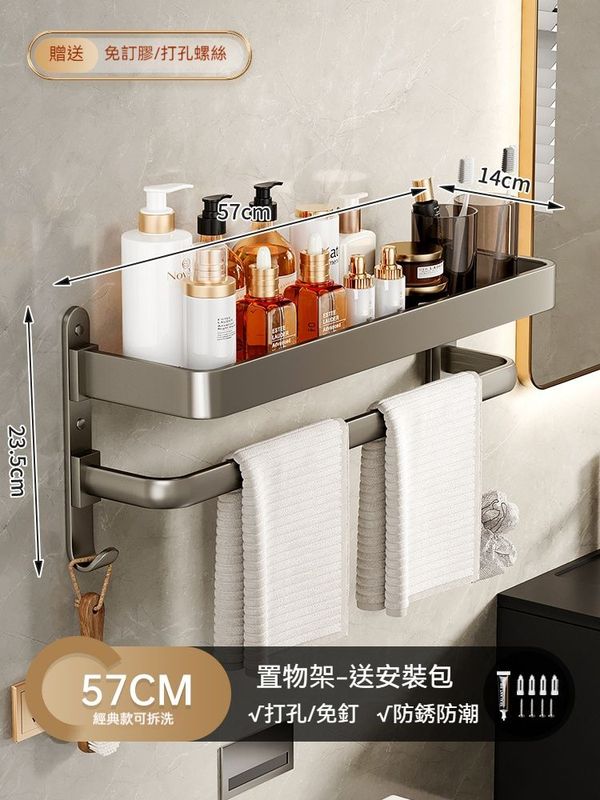 全城熱賣-鋁質免打孔無痕 衛生間置物架 衛浴收納架 壁掛浴室網籃架 毛巾架 毛巾桿 浴室置物架 鋁質掛籃 廚房置物架 調味瓶收納架 化妝品收納架57CM