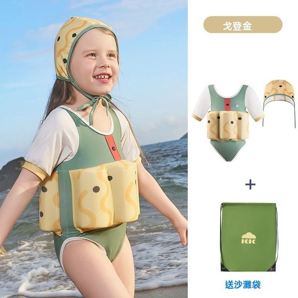 全城熱賣-兒童浮力泳衣 女童男童寶寶泳圈 浮力游泳衣 泳帽+沙灘包顏色:金色