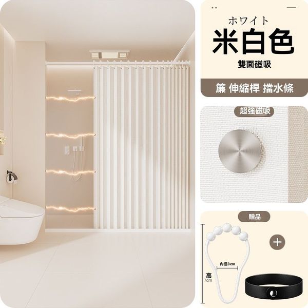 雙側磁吸:米白色【簾+杆子+擋水條】適用120-150cm牆距【簾寬150*高180cm】