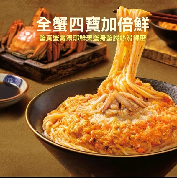 每份包含180g嘅全蟹料包;全蟹四寶加倍鮮,約六隻螃蟹一碗麵。