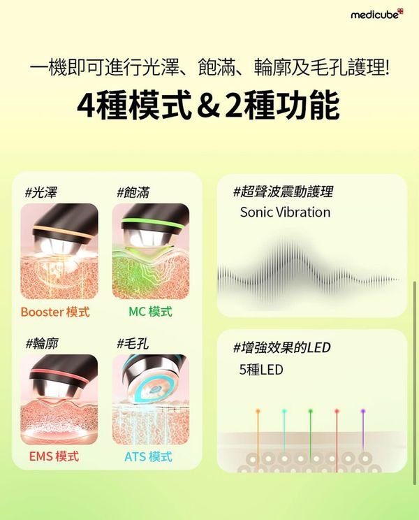 新款AGE-R BOOSTER內含5種LED光照針對肌膚當下狀態調整(可下載App調整)並另外在4個模式當中加入不同聲波震動模式。