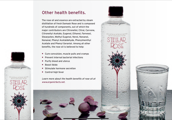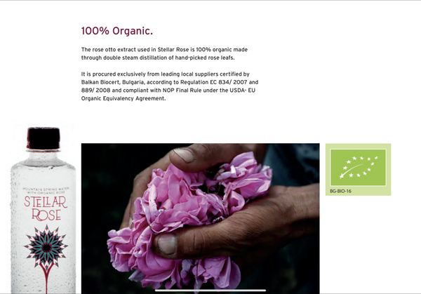 Stellar Rose 中使用的玫瑰油提取物是100%有機的,通過每年5月和6月以手工採摘的玫瑰花並採用雙重蒸汽蒸餾製成。泉水位於羅多彼山(海拔 600 米),泉水通過自然緩慢的沙濾浄化。其特點是質量高、礦化度低、含鹽量低。玫瑰提取物亦經過有機認證,通過手工採摘的玫瑰花以雙重蒸汽蒸餾獲得,並與泉水混合後立即裝瓶。