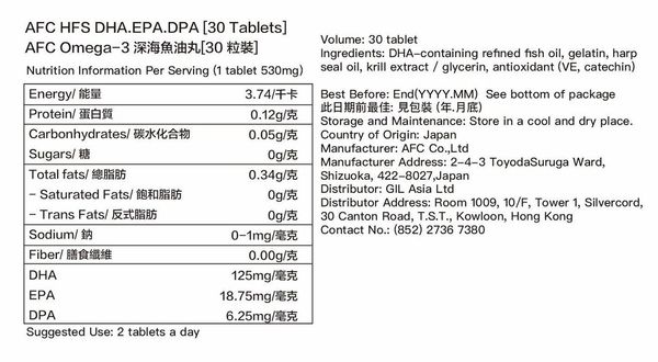 營養成份表示(每1粒530mg):能量:3.74 kcal /蛋白質:0.12g/ 脂肪:0.34g/ –n-3系脂肪酸:0.16g/ 碳水化合物:0.05g/ 食用鹽:0.001g /DHA:125mg/EPA:18.75mg/DPA6.25mg