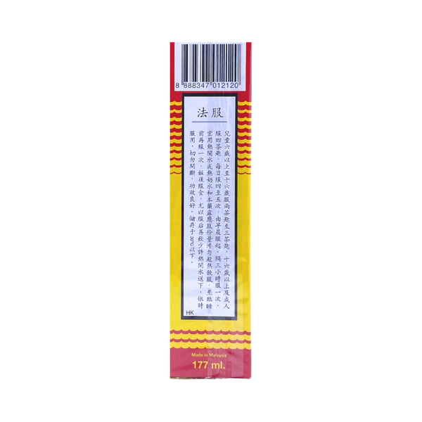 簡介 :傷風咳、寒咳、燥熱咳、乾咳、小兒諸般咳、老人咳、痰多、濃痰、咽喉乾燥癢痛、喉癢、喉痛、潤喉順氣、驅肺風、清肺熱。成份 :榆樹,醋酸胺,苯甲酸,焦糖,吐根根,甘草根,薄荷腦,鴻海蔥球莖,苯甲酸鈉,糖漿,吐魯香樹脂,野櫻桃樹皮。Permit NO.HK-49974