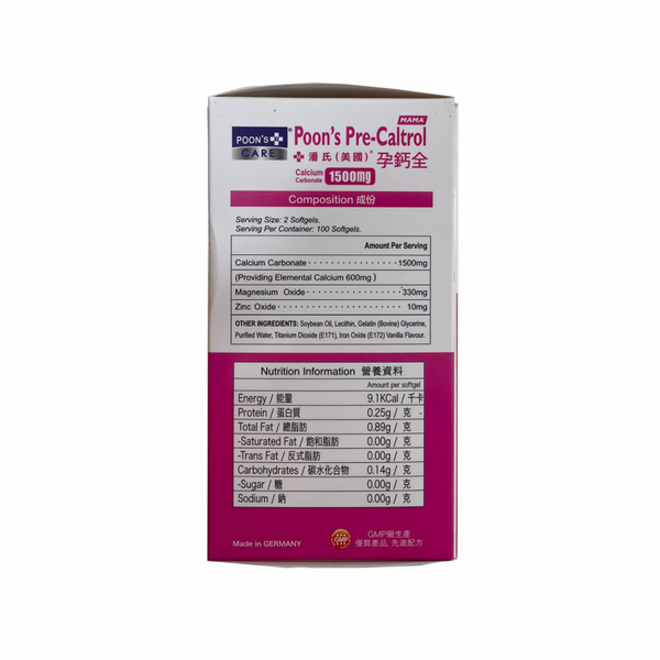 每2粒軟膠囊含1500 MG 碳酸鈣(提供鈣元素600毫克)、330 MG 氧化鎂、10 MG 氧化鋅。