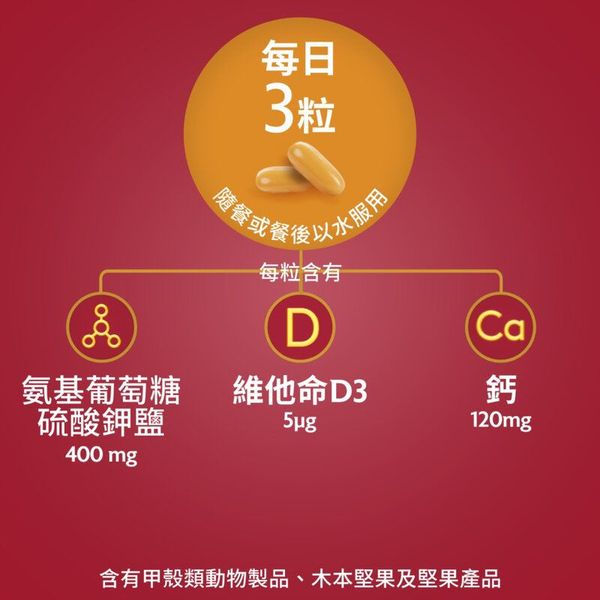 葡萄糖胺, 鈣, 維他命D, 骨骼 特有葡萄糖胺,維他命D3 和鈣配方 支持軟骨健康 維持骨質密度 維持肌肉功能 成人及12歲以上小童:每日3粒,可隨餐或餐後以水服用。
