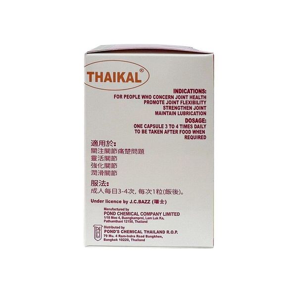 【品 名】THAIKAL泰国强骨力胶囊(万宁版)【规格】100粒/瓶【产地】泰国【成 分】 大枣提取物、碧萝芷提取物、杜仲粉、姜黄【主治】骨骼保护、润滑关节、缓解关节疼痛、缓解骨痛腰痛背痛、颈椎不适、关节劳损、增加骨骼、缓解疼痛【用法用量】成人每次3-4次,每次一粒(饭后使用)【储存方法】存放于儿童不能触碰的地方及阴凉干燥处,避免阳光直射。【注意事项】详情查看产品包装