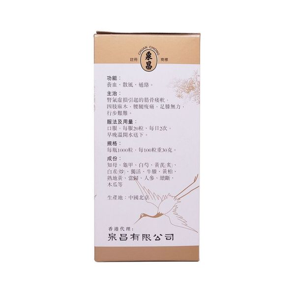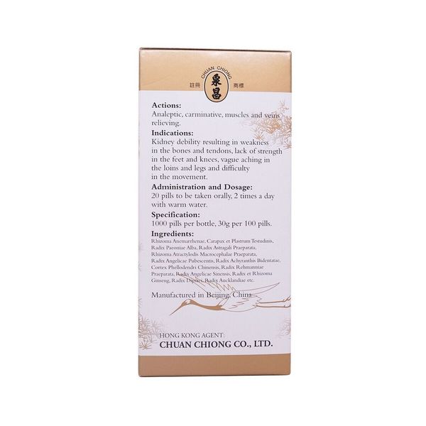 功能主治養血、散風、通絡。用於腎氣虛損引起的筋骨痿軟、四肢麻木、腰腿酸痛、足膝無力、行步艱難。 成分知母、黃柏、龜甲、熟地黃、白芍、當歸、人參等。 服法口服,每服20粒,每日2次,早晚溫開水送服。 規格每瓶1000粒,每100粒重30克。