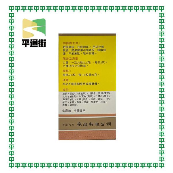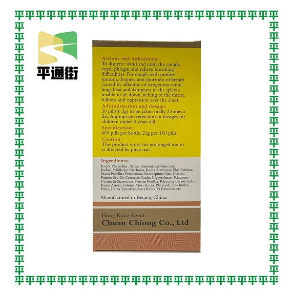 成份:前胡、苦杏仁(去皮炒)、川貝母、百部(蜜灸)、款冬花(蜜灸)、半夏曲(麩炒)、化橘紅(鹽灸)、海浮石(煅)、甘草(蜜灸)、白前、紫蘇子(炒)、射干、紫菀、桑葉、桔梗、旋覆花、茯苓、麻黃等。功能散風鎮咳,袪痰順氣。主治用於外感風邪,肺熱脾濕引起氣促,咳嗽痰盛,不能躺臥,喉中作癢。中成藥註冊編號: HKP-14584