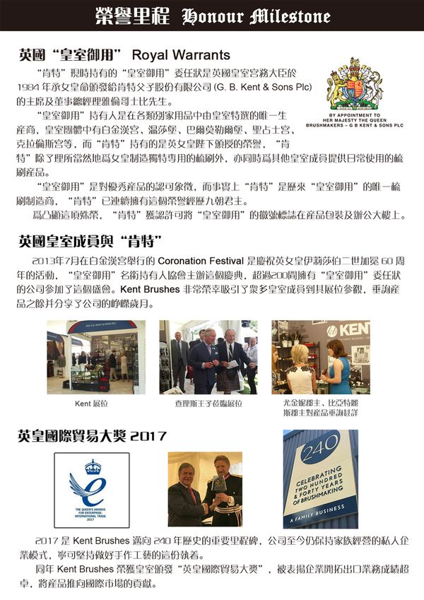 - 在一戰及二戰時期,“肯特”供應了過百萬支的各類刷具給英國海陸空三軍,當時配給的原材料是限制將製成品供給普通消費者的。