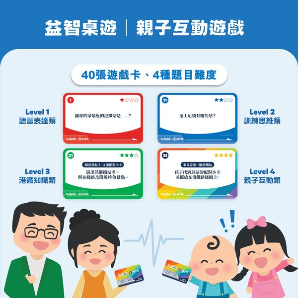 - 遊戲卡玩法:抽取遊戲卡題目作答可促進親子互動,並增強孩子語言表達力、邏輯思維能力及港鐵知識