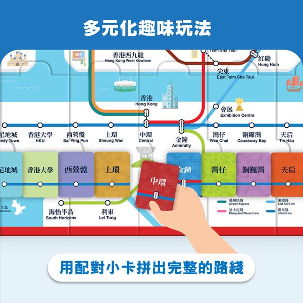- 拼圖玩法:與孩子合力拼砌完整的港鐵路綫圖,訓練觀察力、手眼協調能力