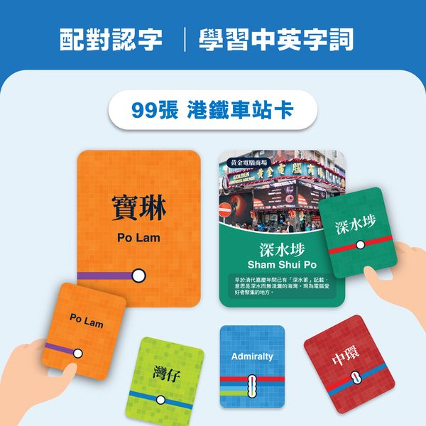 - 認字配對玩法:透過卡片配對遊戲,加深孩子對港鐵車站中英文名的認識及記憶