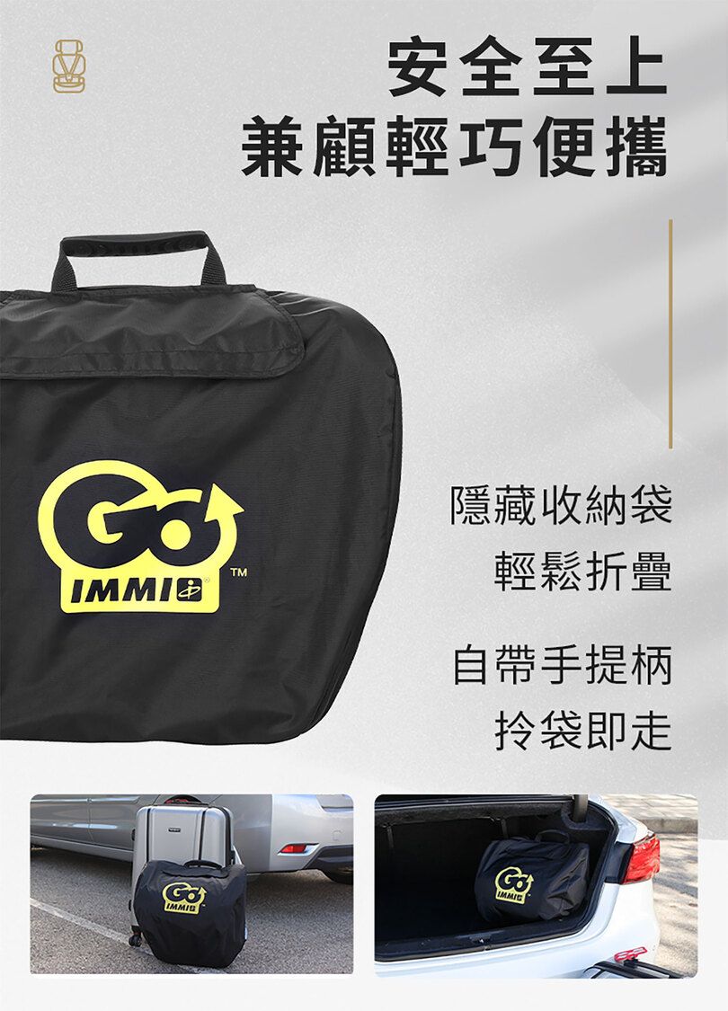 儘管IMMI GO座椅非常適合用作車輛中的永久安裝,IMMI Go更特別考慮到偶爾性的便携需要,例如的Taxi、拼車、租車、與親友旅行。在長途的度假中,也方便您可以在目的地使用自己的兒童汽車安全座椅。