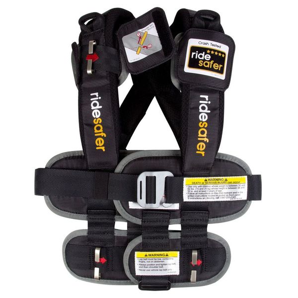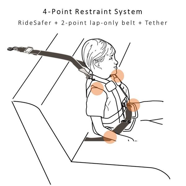 4點式保護: RideSafer通過Tether繫繩帶來穩固兒童的上半身, 使兒童在只有2點式腰部安全帶的汽車也能得到保護.