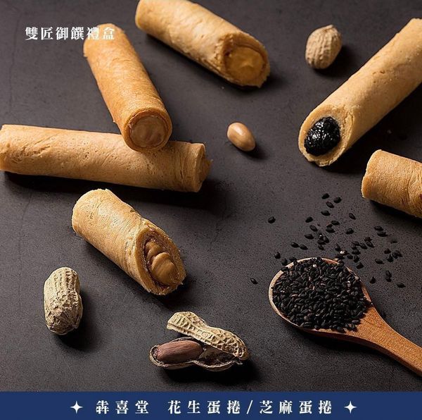 盒內包括:法式金旺酥(6包)花生蛋捲(2支) 芝麻蛋捲(2支) 南棗核桃糕 (120g/袋)