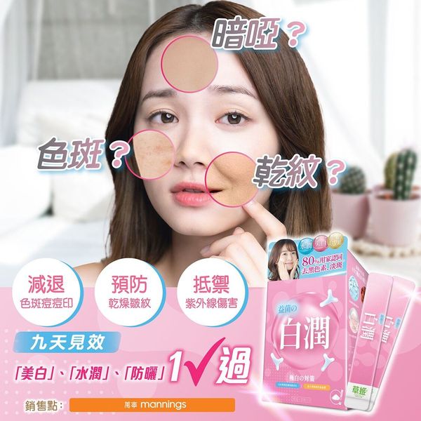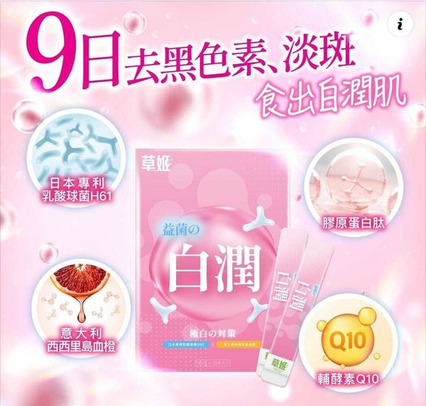 草姬益菌の白潤蘊含4大極白の配方,日本專利乳酸球菌H61、意大利西西里島血橙、水解膠原蛋白及輔酵素Q10。每日一至兩包讓肌膚保持白、潤、彈。