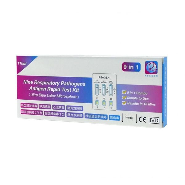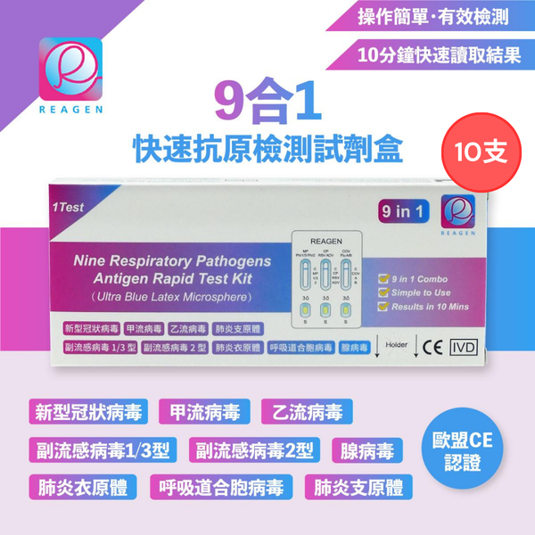 Reagen 9合1快速抗原檢測劑盒 10支 [新型冠狀病毒/肺炎衣原體/肺炎支原體/合胞病毒/腺病毒/副流感1/3型/副流感2型/甲型流感/⼄型流感] (獨立包裝)