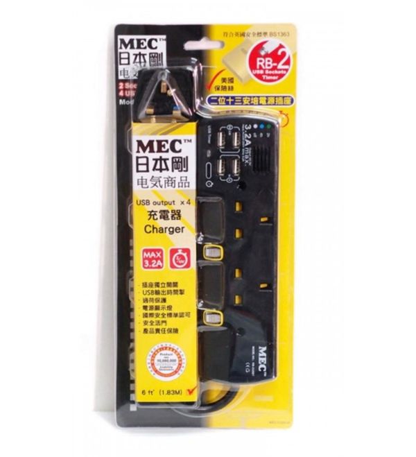MEC RB2USBT/6獨立開關拖板 (4 USB接口, 3.6A, 時間掣, 1.8米, 黑色)