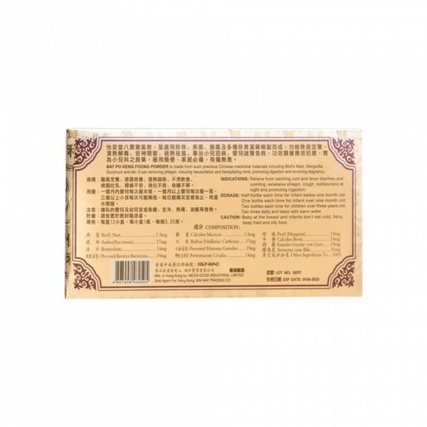 適應:驅風定驚、感冒痰壅、發熱喘咳、不思飲食、疯嘔吐乳 煩燥不安、消化不良、夜睡不寧。用量:一個月内婴兒每次服半瓶·一個月以上婴兒每次服一瓶 三歲以上小孩每次可服兩瓶,每日服兩次至癒為止,用溫 水開服。