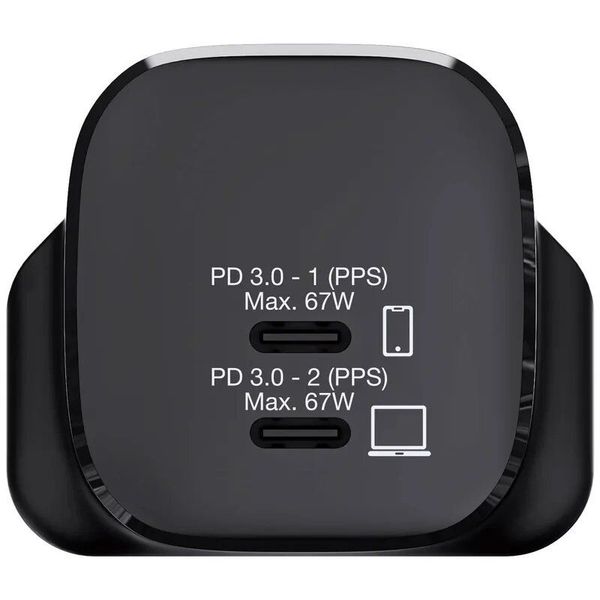 充電器配備2個Type C PD 3.0快充端口,讓您可以同時為兩部裝置充電。每個端口單獨使用時,支援高達67W輸出,亦支援PPS快速充電模式高達45W,能為手提電腦及智能手機用家提供穩定及高效的充電效能。