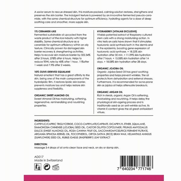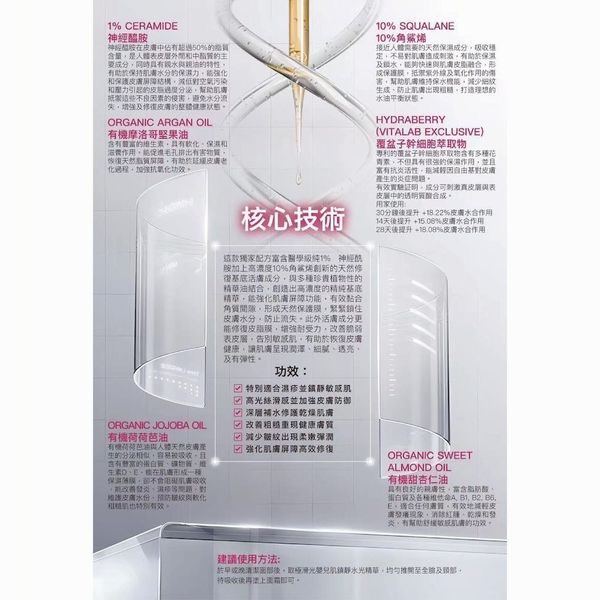 神經酰胺加上高濃度10%角鯊烯創新的天然修復基底活膚成分,與多種珍貴植物性的精華油結合,創造出高濃度的精純基底精華,能強化肌膚屏障功能,有效黏合角質間隙,形成天然保護膜,緊緊鎖住皮膚水分,防止流失。此外活膚成分更能修復皮脂膜,增強耐受力,改善脆弱表皮層,告別敏感肌,有助於恢復皮膚健康,讓肌膚呈現潤澤、細膩、透亮、及有彈性。