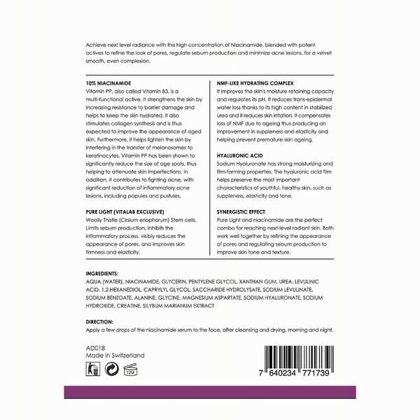 菸鹼醯胺是維他命B3的醯胺化合物,只有122的小分子穩定物質,是一種多功能活性成分,不但適合敏感肌膚使用,也可以減少皮脂分泌,強化皮膚屏障,改善發紅、斑點,黑斑及痤瘡性問題。同時成分亦能有效地幫助肌膚對抗氧化、色素異常和環境壓力的侵害,有助於保持皮膚水分,刺激膠原蛋白的合成,從此減輕面部瑕疵及改善老化皮膚的外觀。