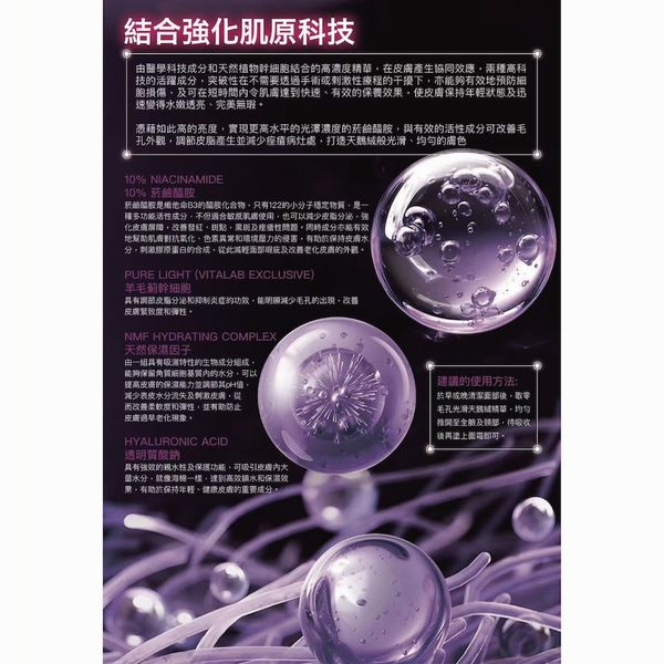 由醫學科技成分和天然植物幹細胞結合的高濃度精華,在皮膚產生協同效應,兩種高科技的活躍成分可在短時間內令肌膚達到快速、有效的保養效果,使皮膚保持年輕狀態及迅速變得水嫩透亮、完美無瑕。可改善毛孔外觀,調節皮脂產生並減少痤瘡病灶處,打造天鵝絨般光滑、均勻的膚色。