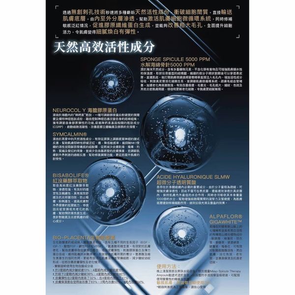 源于海洋天然成分,含有多重矿物元素,不含化学有害物及可增强肌肤锁水性和保湿度,形状似骨骼型的结构体,纤细的微分子网状散开后可以穿透表皮层,直达肌底,能打开肌肤微通道将营养精华直接注入毛孔内,增加活性成分吸收,刺激真皮层活化细胞生长,并调节肌肤微循环系统,疏通毛细血管堵塞,加速老化角质层脱落,有效改善痤疮、毛囊炎、毛孔粗大、细纹、色斑及其他炎症肌肤问题,修复和更新老化细胞,令肌肤更细腻无瑕。