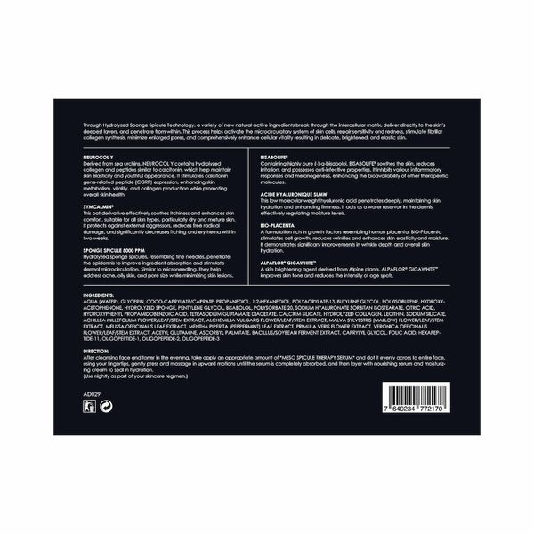 晚上清洁面部及爽肤水吸收后,取出适量Meso Spicule Therapy Serum点涂式涂于全面,以按压的手法按摩至吸收后,可配搭使用营养性的精华及面霜