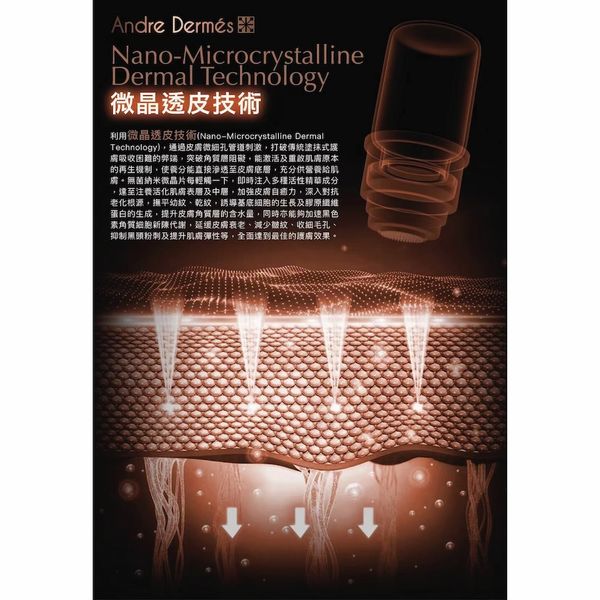 利用微晶透皮技術(Nano-Microcrystalline DermalTechnology),通過皮膚微細孔管道刺激,打破傳統塗抹式護膚吸收困難的弊端,突破角質層阻礙,能激活及重啟肌膚原本的再生機制,使養分能直接滲透至皮膚底層,充分供營養給肌膚。無菌納米微晶片每輕觸一下,即時注入多種活性精華成分,達至注養活化肌膚表層及中層,加強皮膚自癒力,深入對抗老化根源,撫平幼紋、乾紋,誘導基底細胞的生長及膠原纖維蛋白的生成,提升皮膚角質層的含水量,同時亦能夠加速黑色素角質細胞新陳代謝,延缓皮膚衰老、減少皺紋、收細毛孔、抑制黑頭粉刺及提升肌膚彈性等,全面達到最佳的護膚效果。