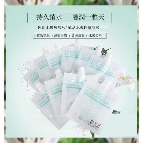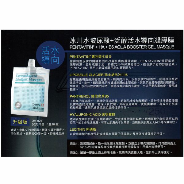 冰川水玻尿酸+泛醇活水導向凝膠膜面膜 (升級版) (補水、提亮、減淡細紋、修護) 每包e30克,10 包1盒 產品編號:DM026